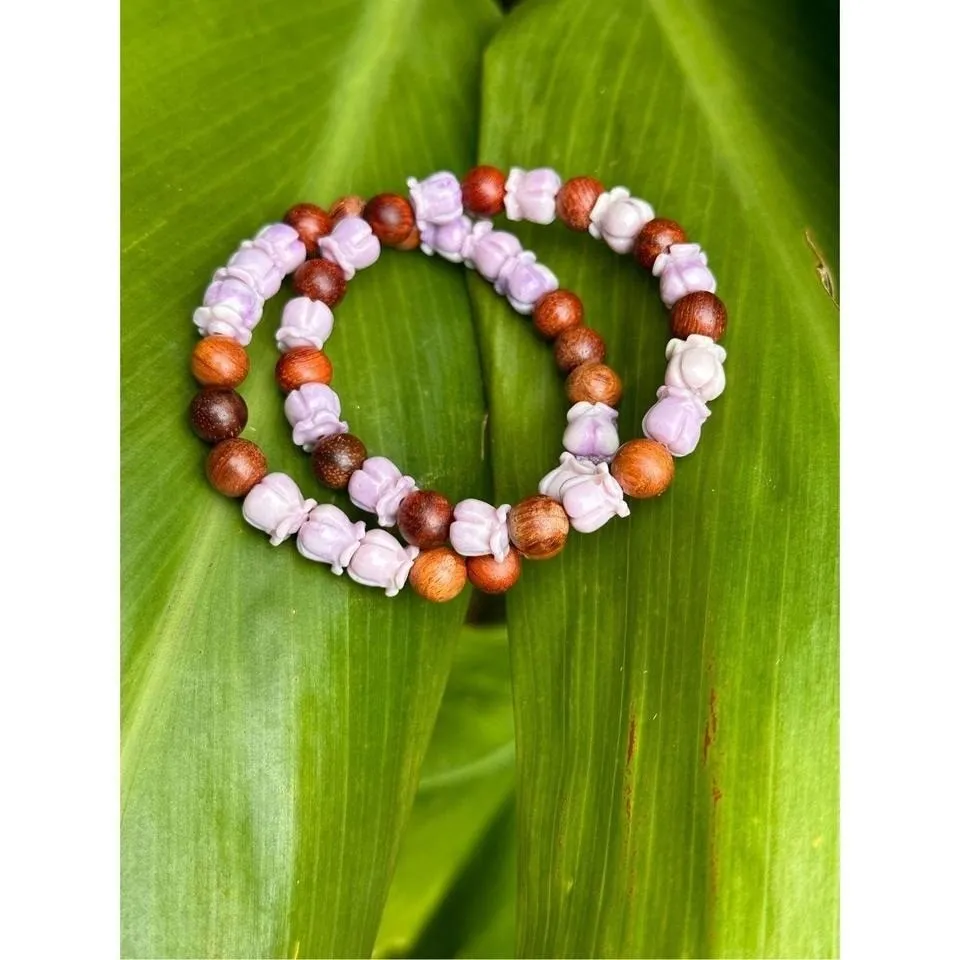 Handmade beaded bracelet. This bracelet features a delightful alternating pattern of smooth, warm-toned 'Iliahi (wood) beads and intricately carved lavender pua kalaunu (crown flower) floral-shaped beads. Add a touch of natural beauty and delicate style to any ensemble. Perfect for everyday wear, a casual outing, or as a thoughtful gift. Style: Beaded - two styles-- your choice 1/1 or 3/3 pattern Type: Bracelet Main Stone Color: Brown Material: Wood, Shell Charm Type: Bead Theme: Bohemian, Fairytale & Fantasy, Love, Boho Shape: Flower Size: Custom, typically 7"-7.25" Main Stone Shape: Round Chain Type: Ball/Bead Features: Stackable Keywords: handmade jewelry, beaded bracelet, floral beads, wooden beads, lavender bracelet, stacking bracelets, natural jewelry, boho style, artisanal, gift idea, unique accessory, wrist wear, dainty jewelry #Tropical #Minimalist #handmade #hawaiian