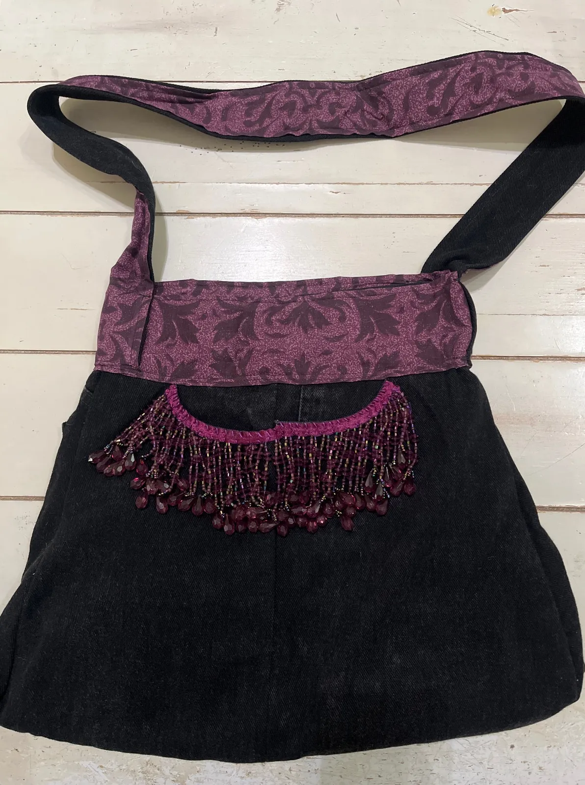 Handsewn Beaded Tassels Body 10.5 inches width top to 17 inches base Body 13.5 inches length Strap drop 17 inches Back Exterior Jean pockets no closure Front exterior pockets above tassels Velcro interior closure Two large interior half height pockets Large center main compartment Simple design Victorian floral interior and strap