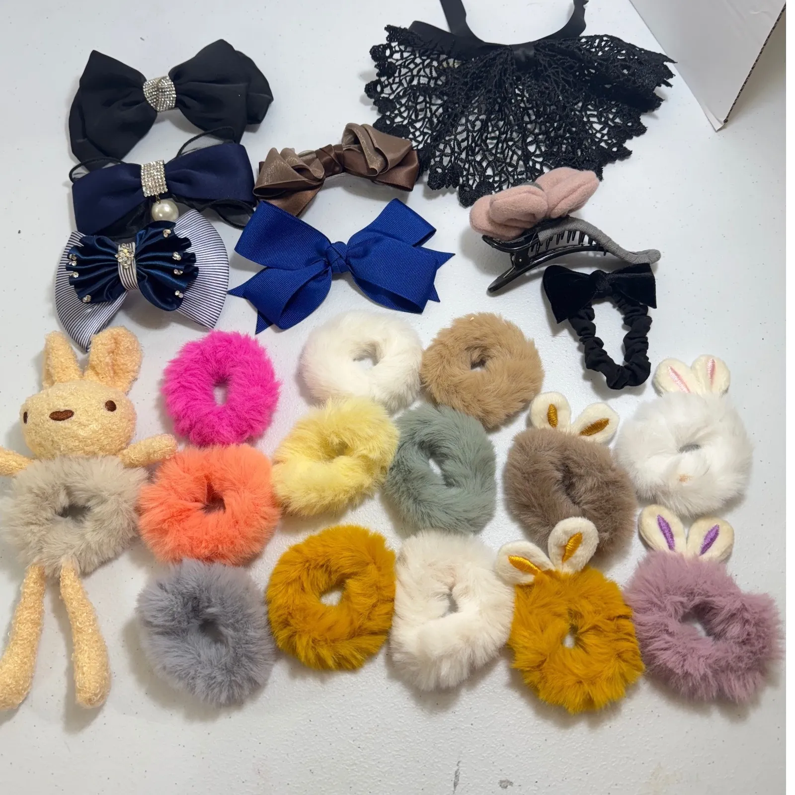 Adorning your hairstyle with playful charm, this collection of hair accessories brings a touch of whimsy and delight to any look. Discover a delightful array of fluffy scrunchies in vibrant hues like hot pink, sunny yellow, and soft lavender, each offering a plush embrace for your ponytail. Elegant bows, some adorned with sparkling rhinestones and pearls, add a sophisticated flair, perfect for dressing up casual outfits. Unique bunny ear scrunchies and a sweet plush bunny hair tie bring an irresistible cuteness factor. A delicate black lace collar with a satin bow, fastened with a 'HANDMADE' clip, offers a touch of gothic romance. Ideal for everyday wear, special occasions like birthday parties, or adding a fun accent to your weekend ensemble. Type: Bow Theme: Fun Material: Fabric, Faux Fur, Polyester Blend Department: Women, Teens Occasion: Casual, Party/Cocktail Hair Type: All Hair Types Accents: Bow, Lace, Rhinestone, Fur Trim, Beaded Shape: Rabbit Pattern: Solid Keywords: hair ties, hair clips, scrunchies, bows, bunny ears, plush, lace collar, handmade, cute, girly, kawaii, hair jewelry, fashion accessories, party favors