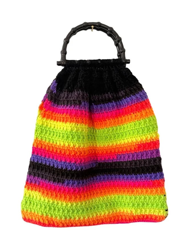 Handmade crochet tote bag featuring bold rainbow stripes in neon pink, orange, green, purple, and black. Designed with black bamboo-style handles and a roomy, flexible open-knit construction. This large tote has plenty of space and natural stretch — perfect for shopping trips, beach days, farmers markets, or as a colorful everyday carryall. Details: • Handmade crochet construction • Multicolor rainbow stripe pattern • Black bamboo-style handles • Soft, open unlined interior • Spacious and flexible design • Condition: Great pre-loved condition Shipping: Ships same or next day. All listings are crossposted. crochet tote bag, handmade market bag, rainbow crochet purse, large boho bag, festival tote, retro knit bag, reusable shopping tote, farmers market