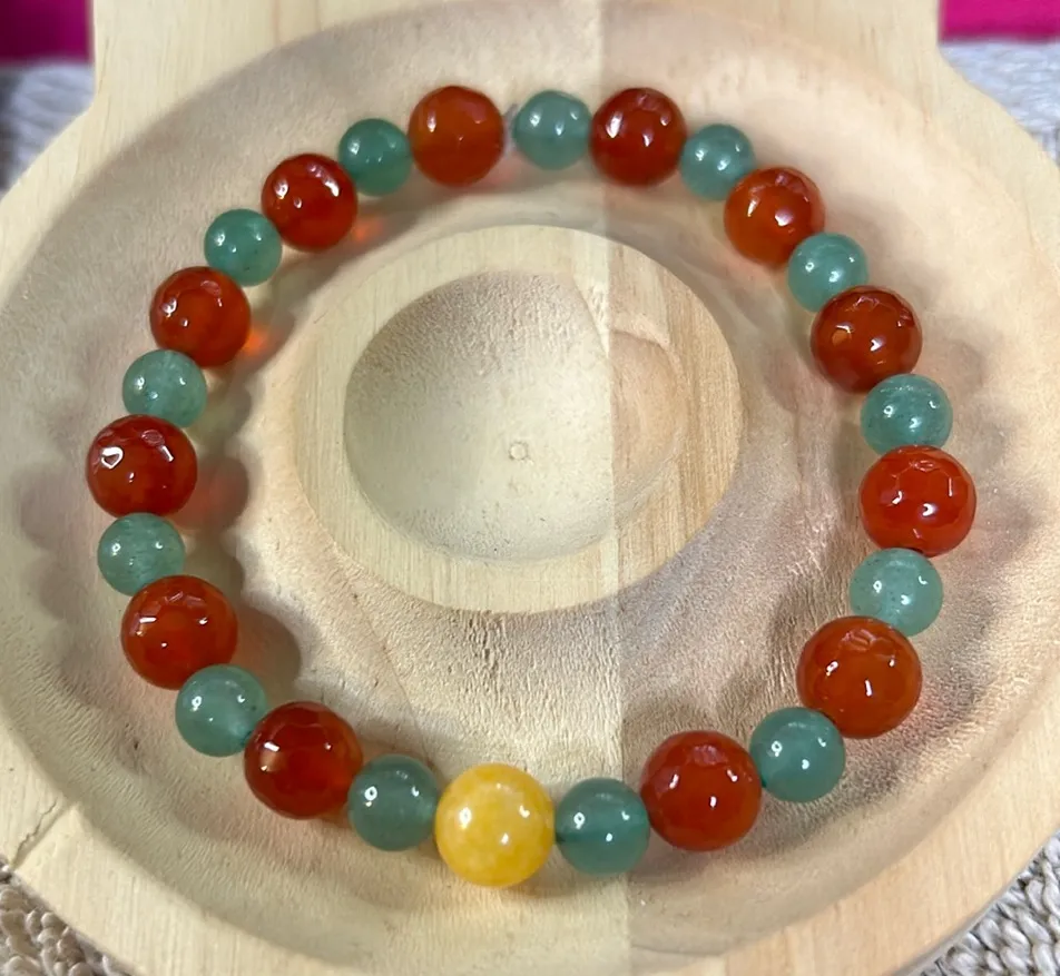 A vibrant stretch bracelet featuring a captivating mix of red, green, and yellow gemstones. This unique accessory is designed to be worn as a stylish accent piece, adding a touch of natural beauty to any outfit. Handmade in Maui, Hawaii Style: Beaded Type: Bracelet Main Stone Color: Red Material: Natural gemstone Main Stone: Red Agate - Yellow Jade center Secondary Stone: 6mm Green Aventurine Theme: Ethnic Shape: Round Main Stone Shape: Round Keywords: gemstone bracelet, stretch bracelet, beaded jewelry, healing stones, carnelian, aventurine, citrine, boho jewelry, minimalist, everyday wear, gift idea, stacking bracelet, natural stones, handmade, jade, agate