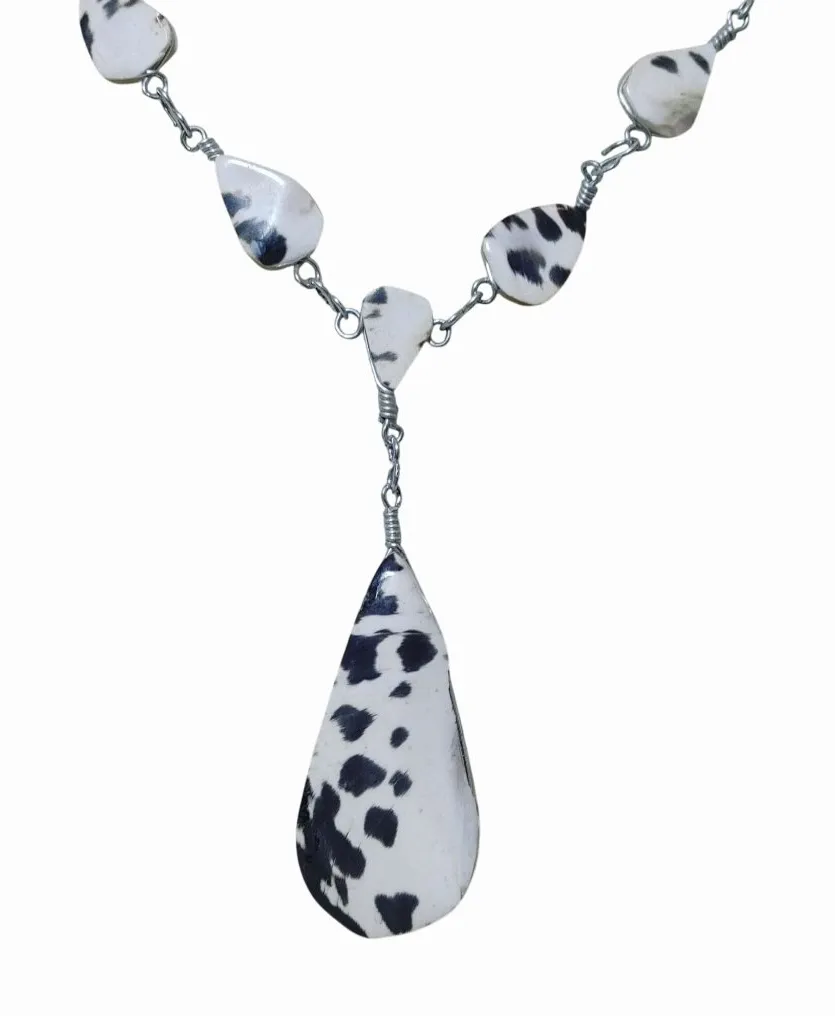 This vintage-inspired necklace showcases a teardrop pendant and matching Dalmatian beads, each wire-wrapped for a timeless, handcrafted appeal. • Handmade wire-wrapped details in Silver • Length approximately 24 inches • Dalmatian MOP with natural patterns • Sturdy and secure clasp closure • Lightweight and comfortable design Pendant length = 2 inches Buyer Information All items are professionally cleaned and sanitized with an ozone treatment prior to shipping. Please note that this process may leave a light, temporary scent. The majority of my listings are pre-owned. Buyers are encouraged to request additional details or clarification before completing a purchase. I respond promptly to all inquiries. Reasonable offers are welcome and will be considered. Jewelry Testing Disclaimer: Gemstones are tested using the Presidium Duo Tester II. While this method confirms gemstone type, it cannot differentiate between natural and lab-created stones.