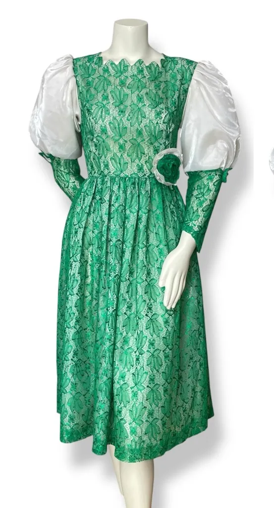 Women's handmade dress in white and glittery green. Puffed sleeves with little bows and pointed cuffs. Large rosette at the waist. Zigzag neckline. Zipper in back. Age unknown. Condition: Preloved vintage with stains on the neckline (mostly on the inside) and on the puffed sleeves. Some wash wear/fuzziness on the lace. Size: Handmade, no size tag. Estimating to best fit an XXS. See approximate measurements for best fit. Pit to pit: 16" Across waist: 12.5" Length: 45.5" This piece has not been cleaned. Dry cleaning recommended. From a smoke-free home. Fast shipper!