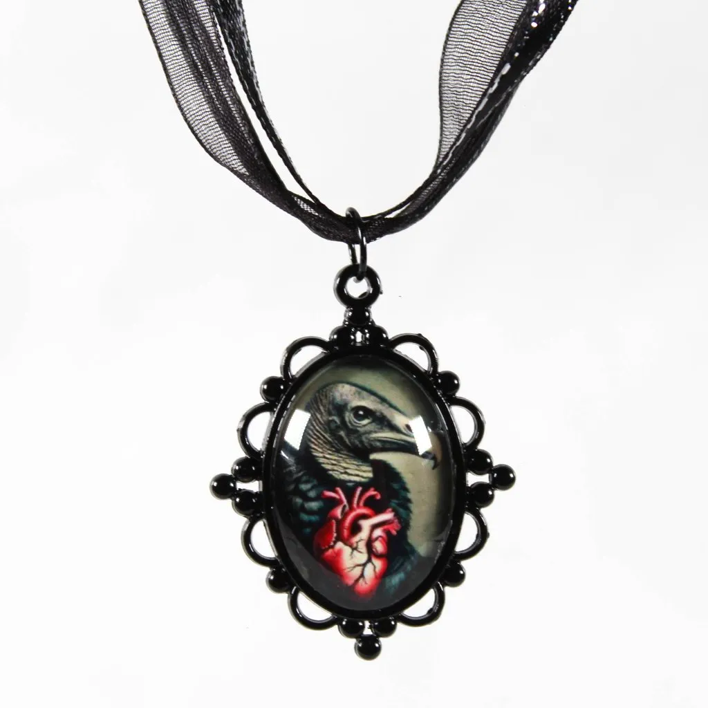 Feast of the Fallen is an ode to the beauty of death, decay, and the fragile spark of life that endures through both. This haunting necklace features a black metal Victorian-style cameo pendant depicting a vulture with wings spread wide, grasping a crimson anatomical heart. Sealed beneath glass, the image evokes the eternal cycle — where even in decay, beauty remains. The rich red heart contrasts with the dark metallic tones, creating a visual dialogue between vitality and ruin. Suspended on a black ribbon with silver metallic flecks, this adjustable 16–18 inch necklace glimmers like twilight silk against the skin. Every pendant is handmade and uniquely sealed, creating subtle variations that add to its antique allure. Details: Pendant size: 1.5” tall x 1” wide Ribbon: black with silver metallic flecks, adjustable 16–18” Black metal Victorian-style frame Glass-sealed original artwork (vulture & anatomical heart design) Handmade with care in our gothic studio Ships gift-ready in eco-friendly packaging This piece isn’t simply jewelry — it’s wearable symbolism. The vulture represents transformation and truth; the heart, love and mortality. Together they remind us that even in loss, there is meaning — and even in darkness, beauty endures.