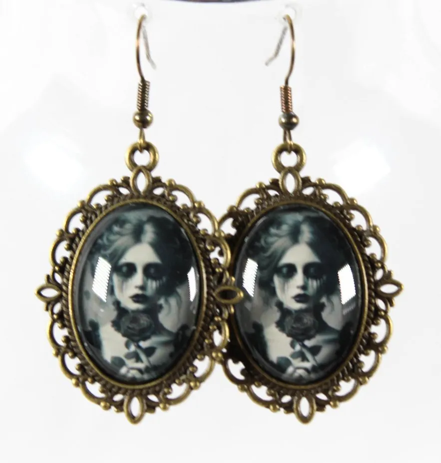 Embrace the delicate beauty of melancholy with the La Vie en Rose Earrings. These handcrafted earrings feature a stunning bronze metal gothic Victorian cameo setting, complete with matching hooks for secure and comfortable wear. At 2 inches from hook to bottom of charm and 1 1/4 inches across, these earrings make a bold yet refined statement. The centerpiece of each earring is an image of a Victorian lady, her face marked by smudged makeup from the tears running down her cheeks. In one hand, she gently holds a rose, symbolizing both love and loss. Her classic Victorian outfit evokes timeless elegance, while the tear-streaked makeup and the subtle melancholy in her expression add a layer of deep, heartfelt emotion. The image is sealed in glass, preserving the haunting beauty of this sorrowful scene. Perfect for lovers of gothic fashion, Victorian aesthetics, and those who find beauty in the bittersweet moments of life, the La Vie en Rose Earrings offer a unique, evocative addition to your collection.