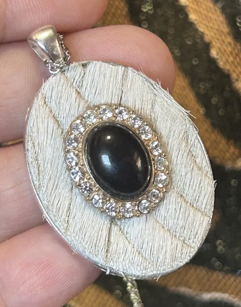Handcrafted cowhide vintage gem cameo pendant on chain necklace, cameo pendant made with real cowhide fur and salvaged vintage glass halo oval gem piece, added to silver plated stainless steel sparkle rolo chain, 18” with 2” extender, pendant 2”x1 1/4”. 8072