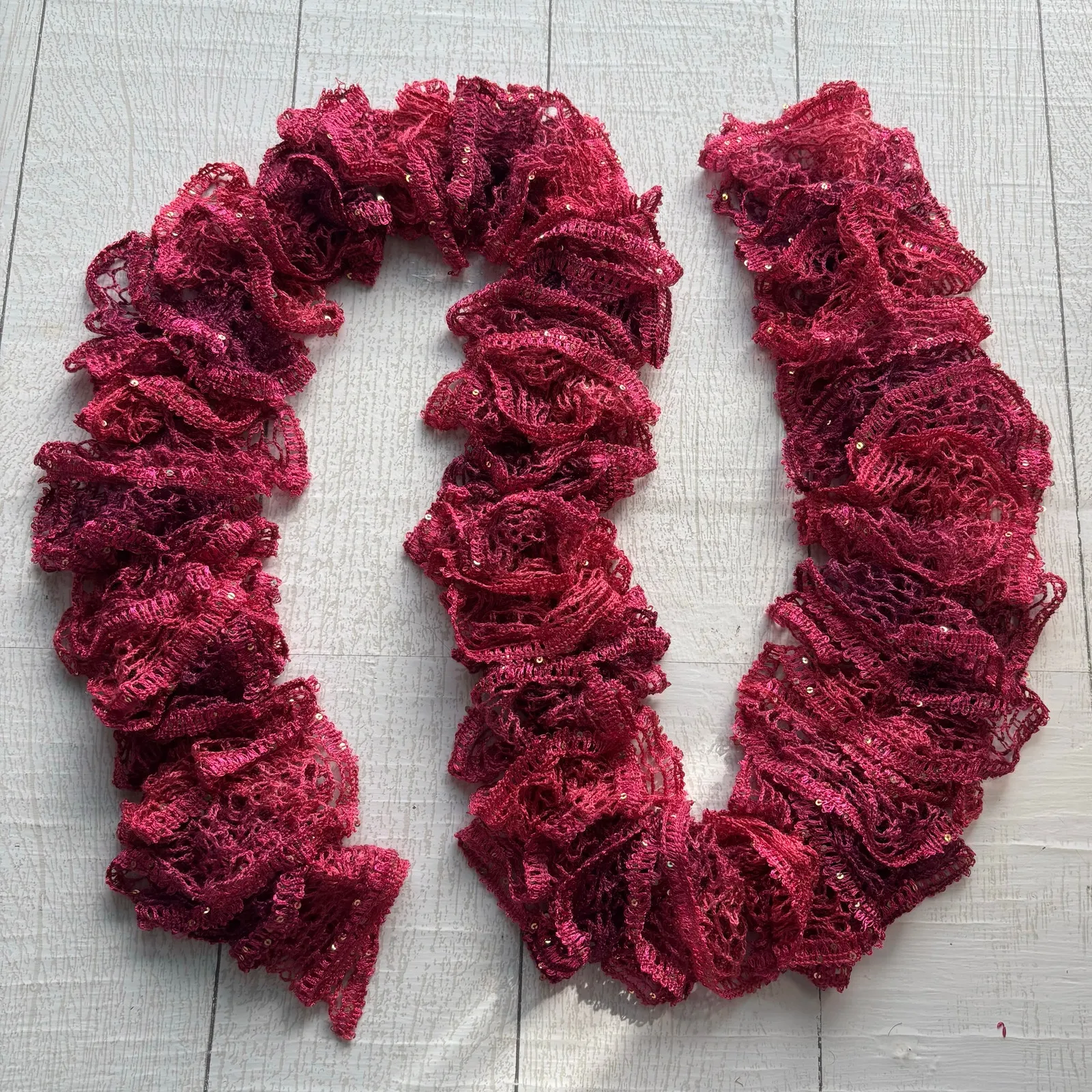 Handmade crocheted ruffle scarf in shades of purple and pink with gold sequin accents. Soft, lightw... Show more