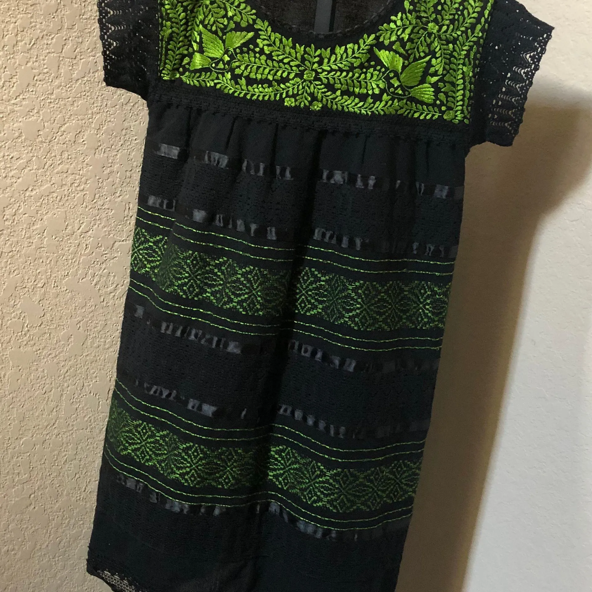 Mexican Black/lime green Short sleeved This dress is an original handmade of Thick material Crocheted, ribbon and embroidery Please see measurements in photo as is custom made without tags Preloved, EUC