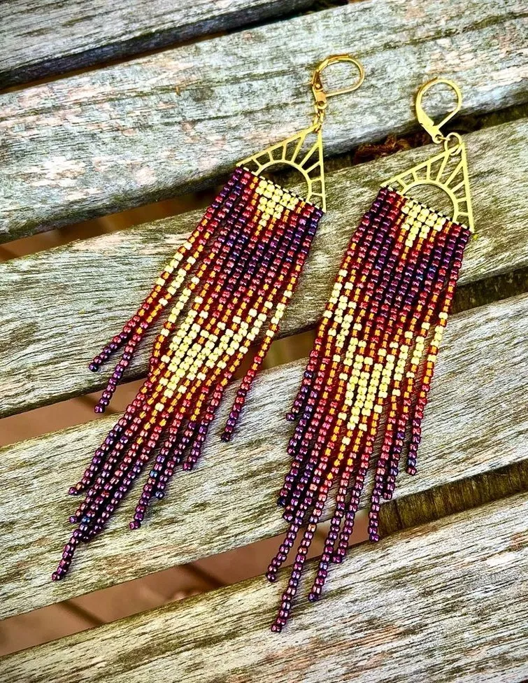 Add a touch of elegance with these stunning beaded boho half sub earrings. Featuring a blend of Japanese glass seed beads (size 11), these earrings are perfect for any occasion. Handmade Round Japanese glass seed beads size 11 Exclusive brass sun triangle sun findings (appearance gold) Brass leverback earhook Approx 4.5” L X 1” wide Design by The Pacific Thread