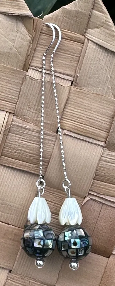 Hawaiian Paua shell Pakalana and Pikake flower Threader earring. Delicate white Pikake Mother of Pea... Show more