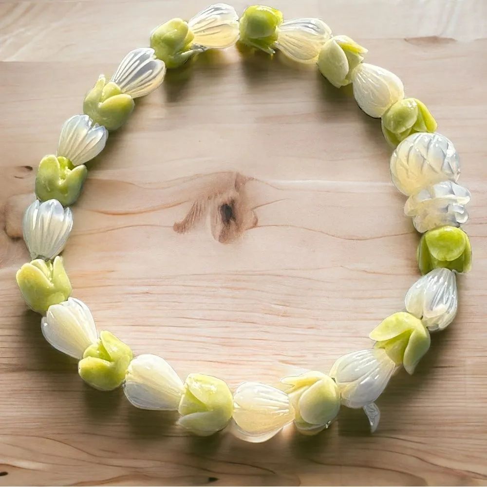 Handcrafted Pikake Mother of Pearl and Pakalana beaded bracelet featuring a delicate arrangement of green and white flower-shaped beads. This charming piece offers a beautiful bohemian aesthetic and can be worn together or separately. Style: Beaded, Statement, Layered, Hawaiian Type: Bracelet Theme: Flowers & Pineapple Main Stone Color: White Pendant Shape: Flower Secondary Stone: Shell Main Stone: Mother of Pearl Main Stone Width: 8mm Pikake / 14mm pineapple Keywords: beaded jewelry, flower beads, bohemian, handmade, floral, charming, whimsical, dainty, garden party, summer, gift, statement, unique, Hawaiian, hawaiian artisan