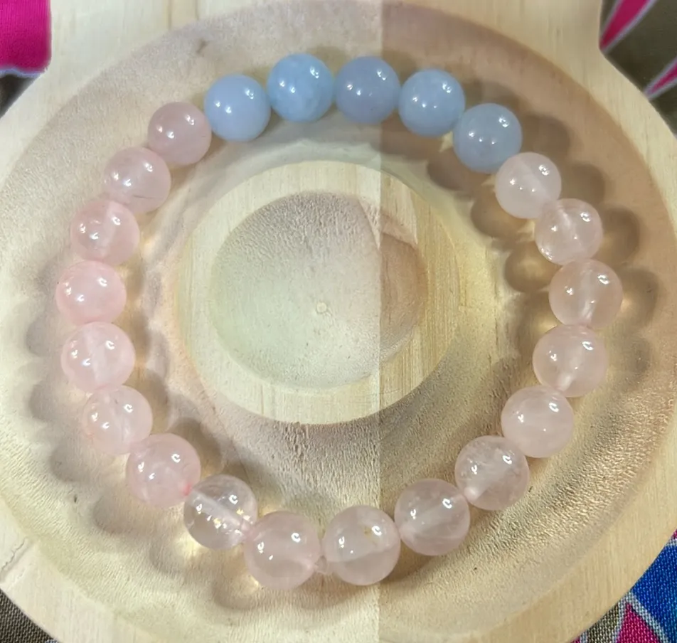 • Bracelet features 8mm rose quartz and jade beads • Crafted with a stunning gradient of soft pink rose quartz to light blue jade • Made on Maui with a stretchable string for a comfortable, adjustable fit • Rose quartz promotes love, emotional healing, and inner peace • Jade enhances harmony, balance, and attracts good fortune and protection —> Together, they create a powerful combination for emotional well-being and spiritual growth.