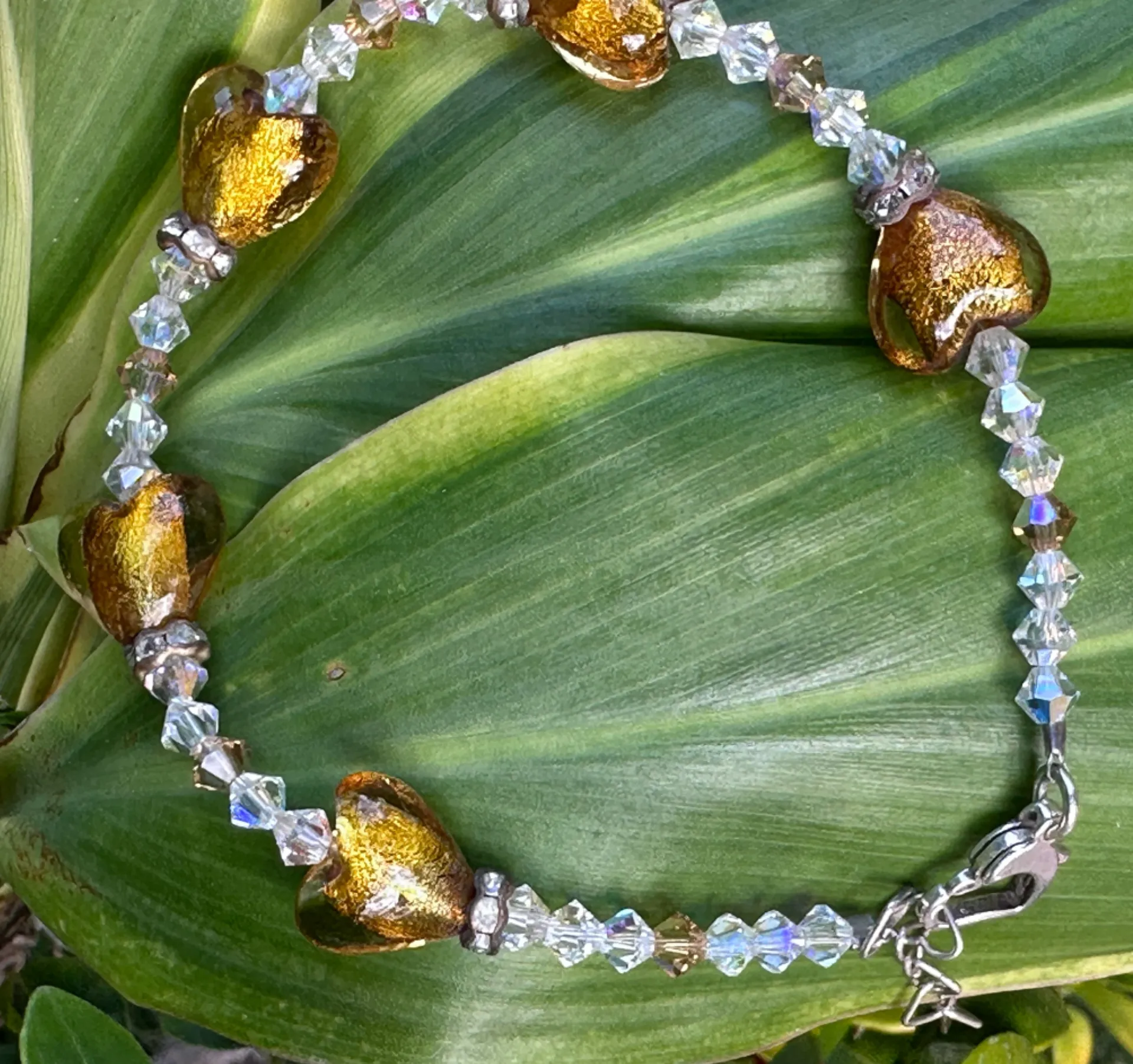 Elegant heart charm bracelet featuring shimmering gold-toned heart beads interspersed with clear Swarovski crystal faceted beads. The bracelet is finished with a secure silver-tone lobster clasp and extender chain for adjustable sizing. Perfect for adding a touch of romance to everyday outfits or as a delightful accent for special occasions. Measurements: • Length: 9 in (with extender) Style: Beaded, Charm Type: Bracelet Main Stone Color: Gold Material: Glass Metal: Silver Main Stone: Crystal Secondary Stone: Crystal Charm Type: Bead Theme: Love, Nature, Bohemian Shape: Heart Main Stone Shape: Heart Closure: Lobster Keywords: heart bracelet, crystal bracelet, gold heart beads, silver tone clasp, women's jewelry, dainty bracelet, romantic jewelry, gift for her, anniversary gift, birthday gift, everyday jewelry, handmade style, adjustable bracelet