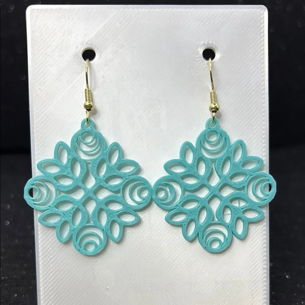 3D-Printed Earrings Add a modern twist to your jewelry collection with these stunning handmade 3D-printed earrings! Crafted with precision using high-quality, eco-friendly PLA filament, each pair is lightweight, durable, and designed to turn heads. Perfect for everyday wear or special occasions, these earrings blend art and technology to create a truly one-of-a-kind accessory. Details: •Material: Eco-friendly PLA plastic biodegradable • Hooks: Hypoallergenic, nickel-free metal (great for sensitive ears • Size: Height 2 inches width 1 1/2 inch • Weight: Ultra-light for all-day comfort Why You’ll Love Them: • Unique and trendy designs you won’t find in stores • Made to order with care and creativity What to know about 3D Printed Jewelry: These pieces are made to order and printed a pair at a time in our 3D printers. Art Designed by Webbuster on Makers World. A nozzle dispenses PLA Filament at a high temperature to create a 3D print layer by layer. The print is created from the bottom up and details of this process can be seen in the finished product. If you look closely at our earrings, you may see lines that are indicative of the path the nozzle traveled to create the piece. Because of this, 3D Prints are NOT to be compared to mass or commercially produced plastic pieces. Each one is unique, susceptible to variation, and shows distinct signs of its creation process that we believe adds character and sacredness . Hope you enjoy my handmade jewelry. D508