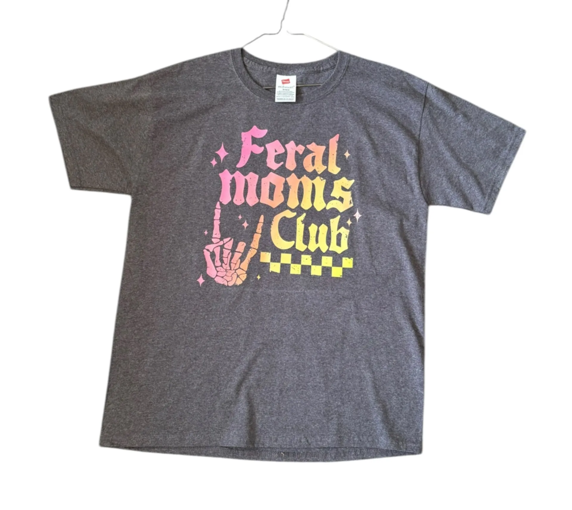 Comfortable gray tee with bold pink and yellow graphic. Perfect for casual wear.