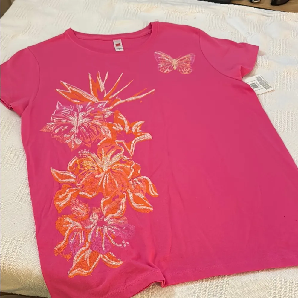 Vibrant pink short sleeve tee. Features orange floral and butterfly design. Soft fabric for everyday... Show more
