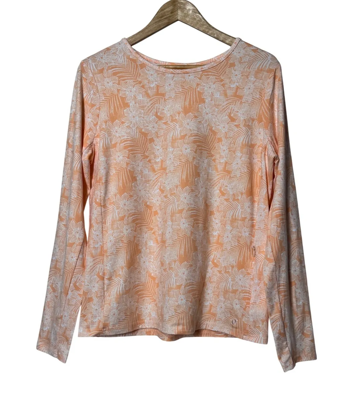 A women's long sleeve top by Hang Ten featuring a vibrant orange and white floral and palm leaf print. This top offers UV protection with UPF 50+ making it perfect for outdoor activities. It has a comfortable crew neckline and long sleeves for added coverage. The fabric has a slight stretch for ease of movement. Ideal for beach days, hiking, or casual wear. Measurements: • Chest pit to pit: 20 in • Sleeve length: 23 in • Length shoulder to hem: 24 in Department: Women Type: T-Shirt Style: Pullover Features: UV Protection, Pockets, Breathable, Lightweight, Stretch Neckline: Crew Neck Performance/Activity: Hiking, Beach, Gym & Training, Running & Jogging, Walking Sleeve Length: Long Sleeve Closure: Pullover Theme: Palm Material: Polyester Blend, Spandex Keywords: Hang Ten, long sleeve, UV protection, UPF 50, floral print, tropical, athletic, performance, outdoor, beachwear, activewear, casual, sun shirt Reasonable offers always happily accepted