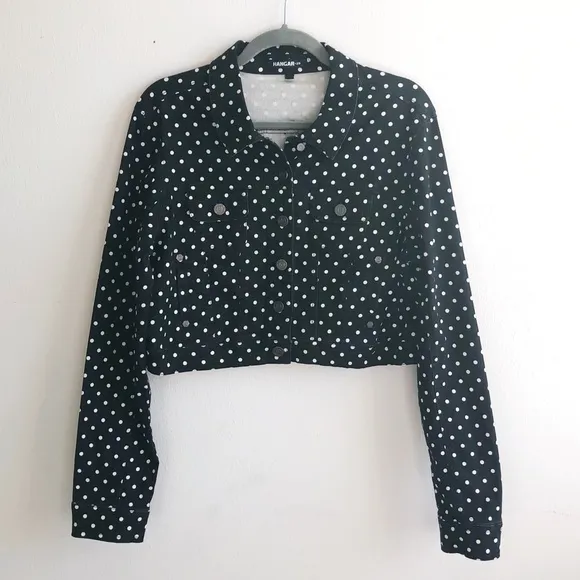 Hangar-29 Cropped Jacket Polka Dots Sz XL GUC. Great jacket features: - black background w/ white polka dots - cropped style - long sleeves - button front - collar - “jean” jacket style & weight - two button-front breast pockets & HAND POCKETS!! - armpit to armpit 21” - length 18” - 98% cotton, 2% spandex GUC - top button is missing button cover; won’t even notice when wearing. Hangar-29 is an urban brand from Canada. Ask with questions F2