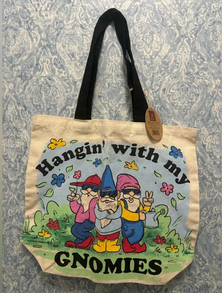 This is a medium-sized canvas tote bag with a multicolor exterior featuring a painted gnome design. The beige canvas handle/strap matches the beige lining material. The tote bag is designed for women and has a theme of art. The brand is Art Studio Company. This is a super cute shopping tote with the design on both sides.