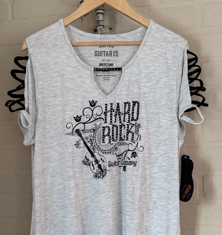 Stylish gray tee featuring a bold guitar graphic and 'Hard Rock' text. Perfect for casual wear. Hard Rock shirt Gray Graphic Tee with Guitar Co Print xl cold shoulder lattice Rhinestone sparkle embellishment Authentic Approx 30” long, 23” pit to pit Rocker Biker Bling Makes a great gift