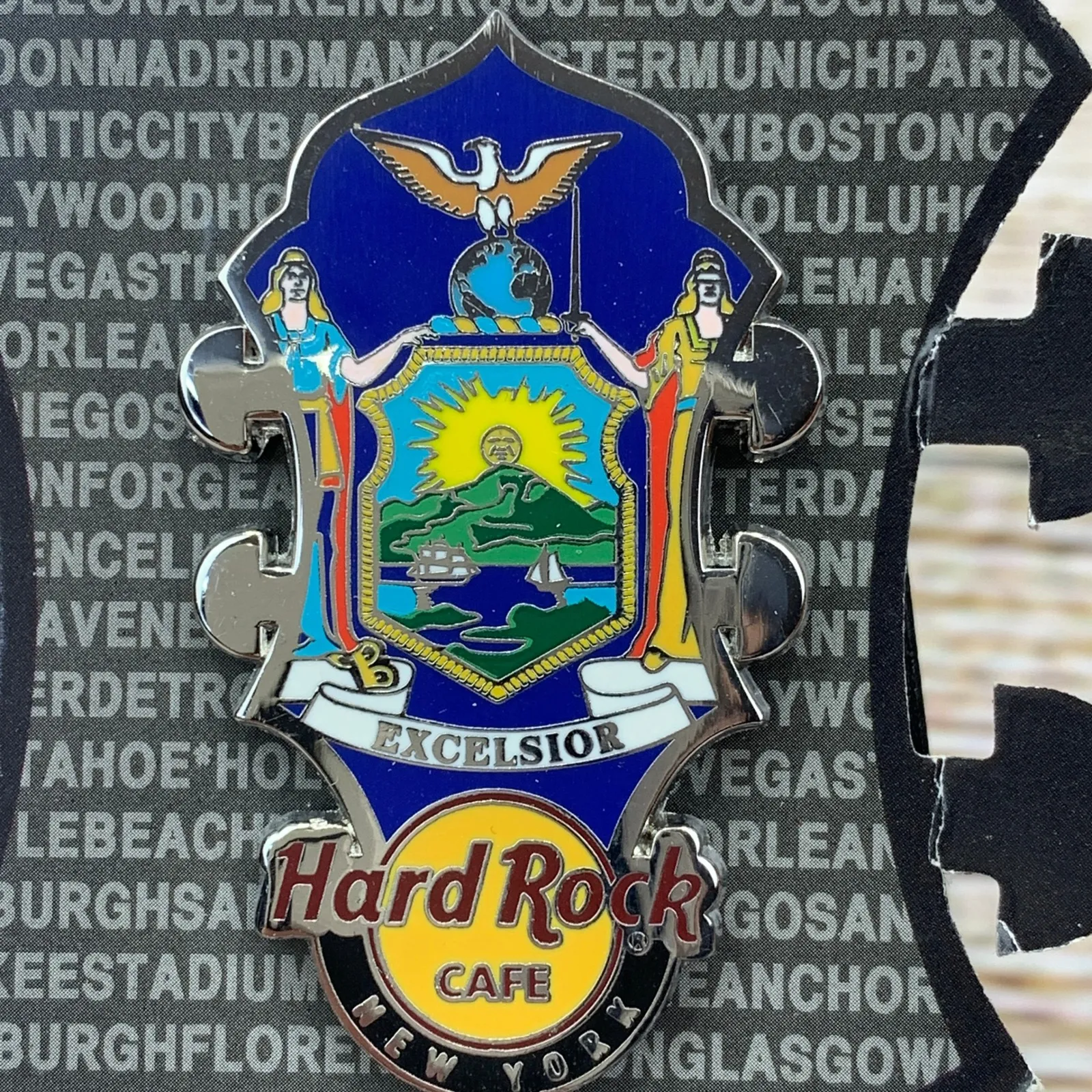 Collectible Hard Rock Cafe New York Headstock Flag Pin, a must-have addition for pin collectors and... Show more