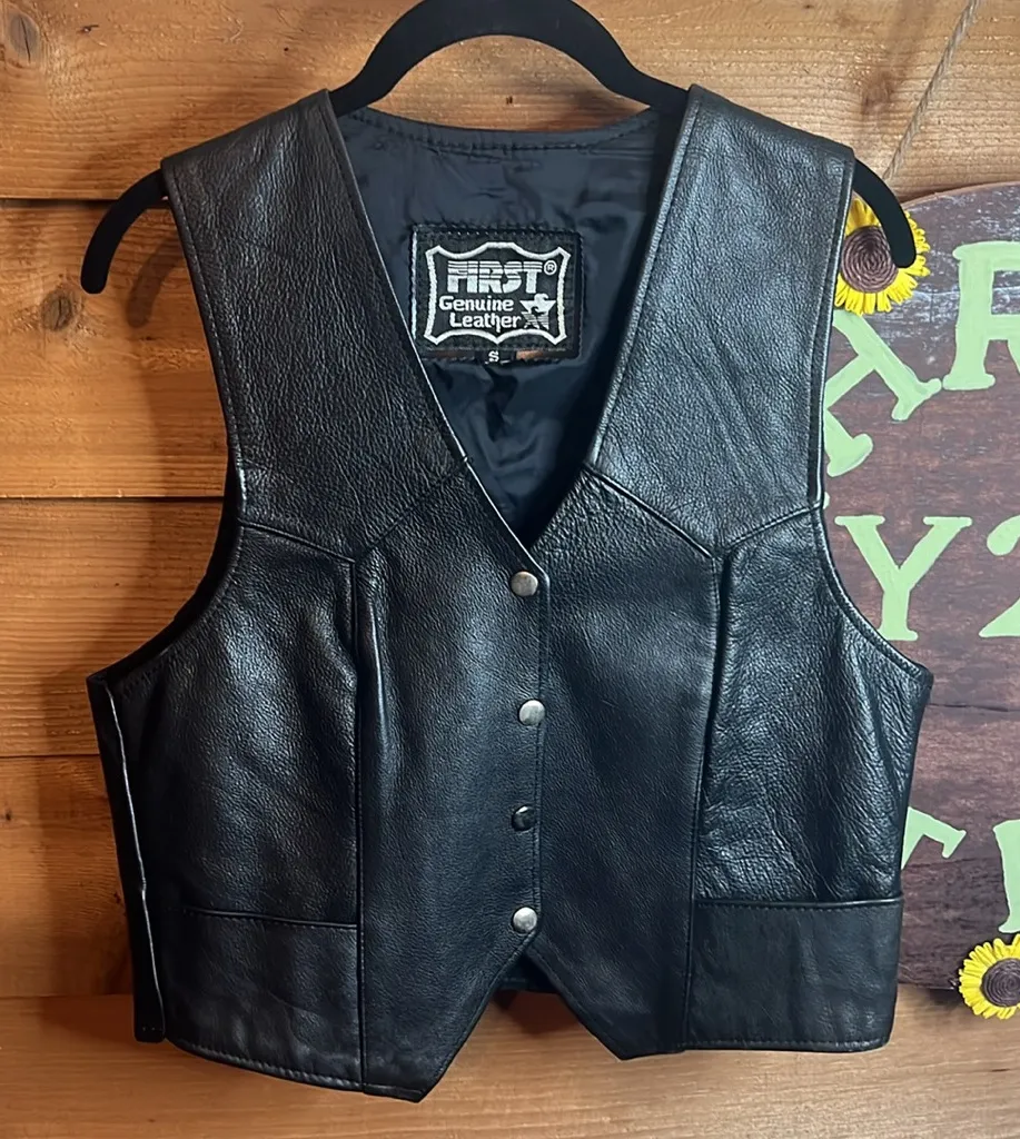 Brand: First Leather - Harley Davidson Description: Genuine leather vintage black vest with pockets! Snap button closure with NO rips, holes, stains, or tears. Fully lined interior. SUCH a cool moto riding vest! Minor wear on buttons. Next day shipping!! Measurements taken with the item laying flat Size women’s small P2P 17 1/2” Length shoulder to bottom 19” Photos are taken under lighting which may cause a variant in color. Please understand every attempt is made to capture true and accurate color. If available, a stock photo may be provided in the photos. All items are suggested to be cleaned according to tag/instructions prior to wear. All items are stored in plastic ziplock bags, free of dust. Thanks for checking out my closet! I also sell on other platforms. No cancellations. I am not responsible if full description isn’t read in its entirety. Tags: designer retro unisex men streetwear vest grandpa goth moto motorcycle bike Mobwife brunch black patch button