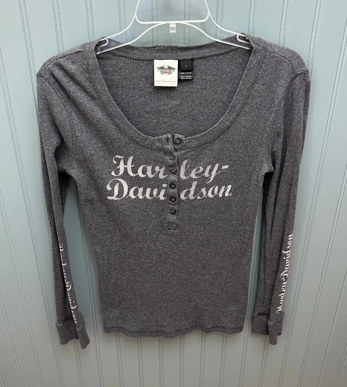 Embrace edgy elegance with this Harley Davidson henley shirt! Boasting a flattering scoop neckline and long sleeves, this ribbed knit top is a cozy yet stylish statement. The iconic Harley Davidson logo is emblazoned across the chest and sleeves, adding a touch of rebellious charm. A three-button placket adds versatility, while the fitted silhouette enhances your figure. A winged Harley-Davidson logo is on the back. Picture yourself rocking this top at a casual weekend gathering, a motorcycle rally, or a night out with friends where you want to channel your inner biker chick. Color: Gray Type: T-Shirt Department: Women Style: Basic Material: Cotton, 100% Cotton Neckline: Scoop Neck Sleeve Length: Long Sleeve Sleeve Type: Classic/Fitted Sleeve Accents: Button Pattern: Solid Features: Breathable, Fitted, Logo, Ribbed, Lightweight Character: Biker Fit: Slim Keywords: Harley Davidson, Long Sleeve Top, Ribbed Shirt, Henley Shirt, Motorcycle Apparel, Biker Shirt, Gray Top, Womens Shirt, Scoop Neck, Casual Top, Rocker Style, Comfortable Shirt