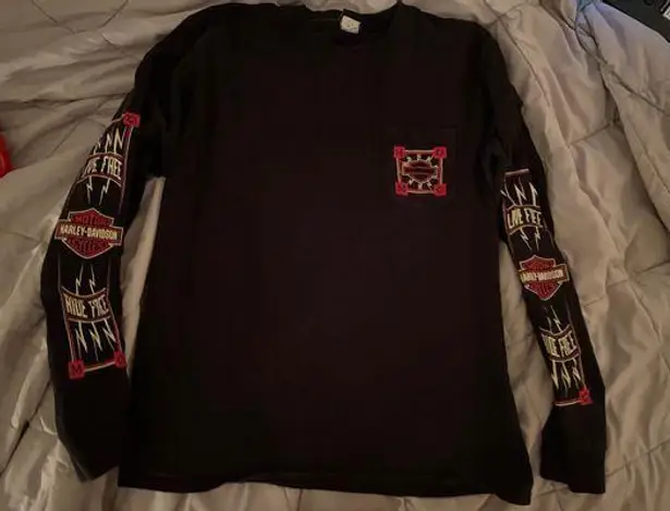 The classic American motorcycle brand Harley Davidson is world-renowned for its grungy graphic tees, tank tops, leather jackets, and sweatshirts— which typically feature skulls, flames, and other timeless motorcycle-inspired designs.