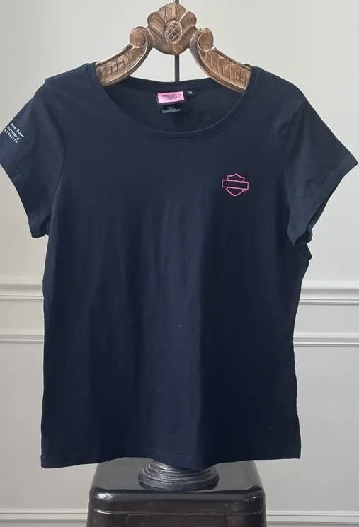 Harley Davidson, motorcycle breast, cancer awareness, cap sleeve T-shirt featuring the pink silhouette of the Harley Davidson logo on the chest and a graphic with, “no one rides alone“ across the back. 100% cotton. Please note the tag size on this T-shirt is 2X however, it runs small in my opinion and fits me as a size large so please double check measurements to ensure the proper fit for you: 26.5 inches shoulder to hem and 21 inches armpit to armpit.