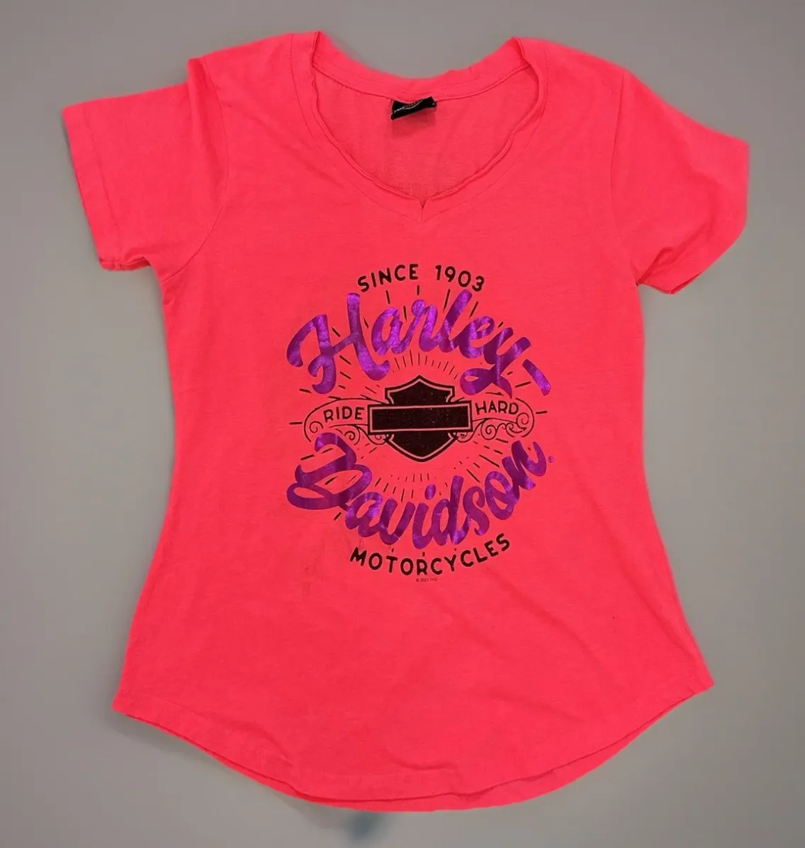 Ignite your inner rebel with this vibrant Harley Davidson t-shirt. Boasting a brilliant pink hue, th... Show more