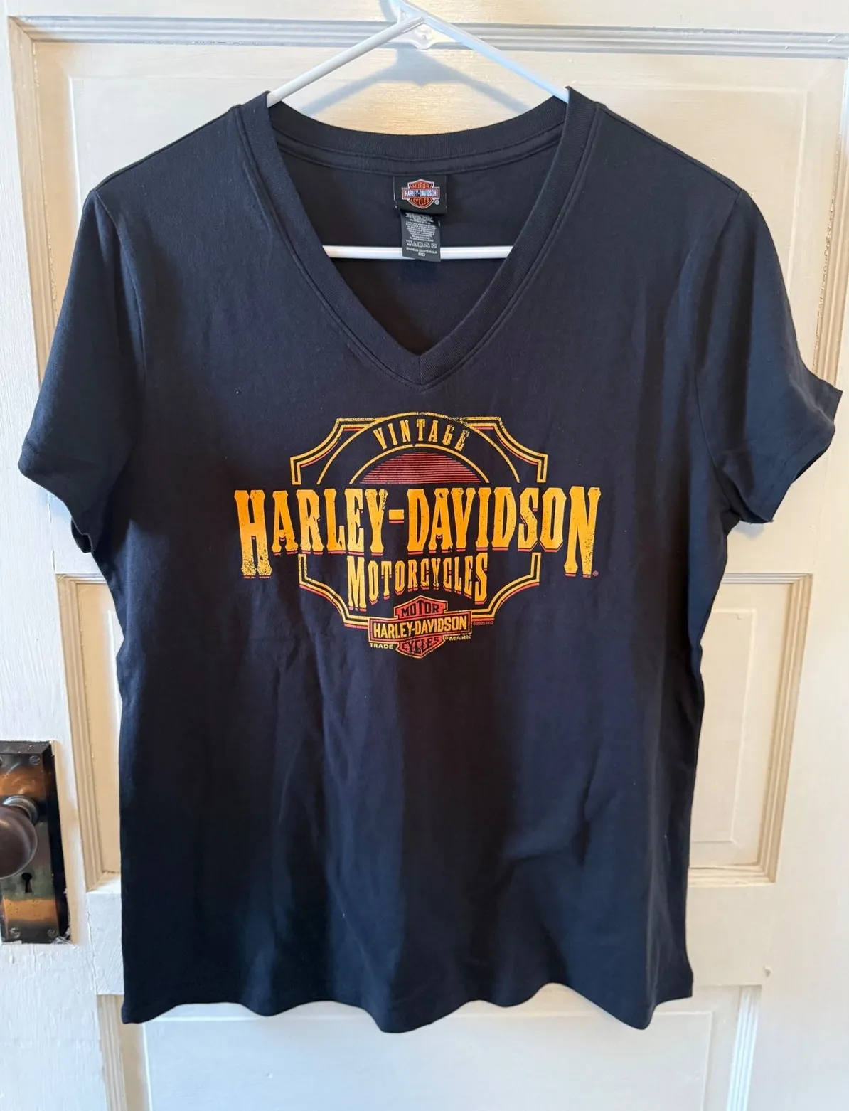 Channel your inner rebel with this striking Harley Davidson V-neck tee. The bold vintage logo, emblazoned in vibrant yellow and orange, pops against the classic black fabric, exuding an undeniable cool factor. This shirt is perfect for adding a touch of iconic American spirit to your everyday look. Wear it out for a casual day of errands, to a rock concert, or on a weekend motorcycle ride. New with out tags Black vneck Keywords: Harley Davidson, Motorcycles, Vintage, V Neck, Graphic Tee, Womens T Shirt, Black T Shirt, Iconic, Streetwear, Casual, Biker Style, American Classic