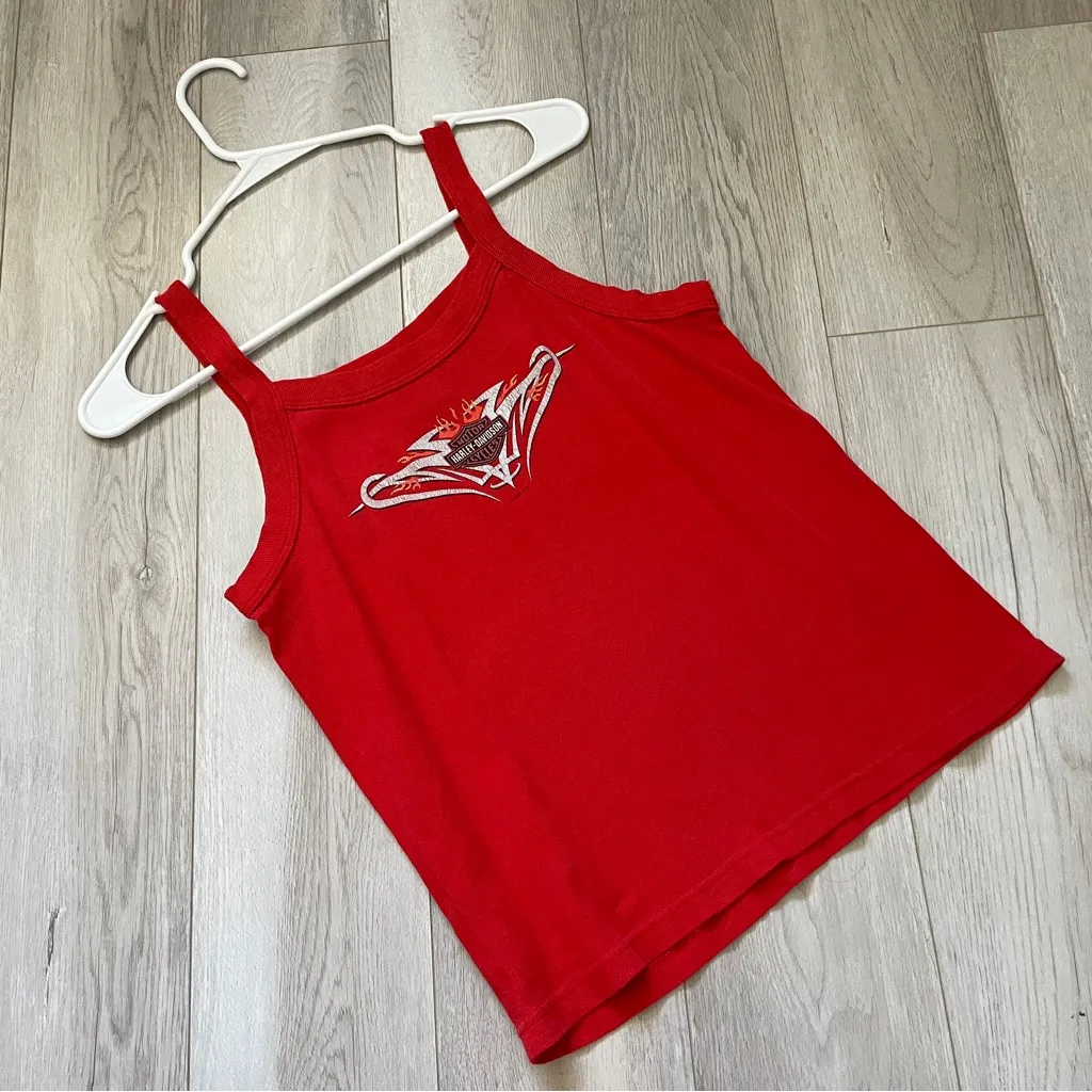Harley-Davidson Lancaster California Tank Top in the color Red. Scoop neckline, wide straps, sleeveless, crop length. Stretchy, ribbed knit fabric. Harley Davidson graphic on front, location graphic on back. Size large, womens. In pre-loved condition, there is cracking on the graphic both front and back as shown in photos. Super cute y2k, casual, retro, spring summer, biker style. //B743, 3.4