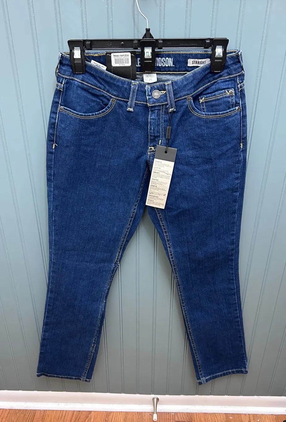 Embrace iconic American style with these brand new Harley Davidson denim jeans. Crafted for a flattering fit, these mid-rise straight-leg jeans offer a comfortable and timeless silhouette. The dark wash denim provides a versatile foundation for countless outfits, while the signature Harley Davidson detailing adds a touch of rebellious spirit. Perfect for casual weekend outings, motorcycle rides, or adding a cool edge to your everyday look.