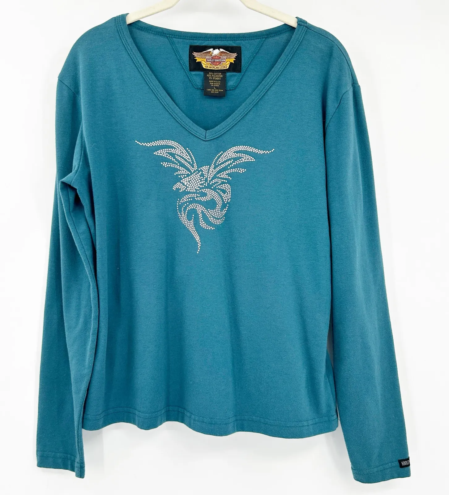 Harley Davison Womens VTG Vintage Y2K Bedazzled Eagle Biker Shirt in Teal. Size large. Good preowned condition. There is some pilling throughout (see photos). - Bedazzled Eagle - V-Neck - Long Sleeve - Pullover - Stretch - 50% Cotton, 42% Polyester, 8% Elastane Tags- Y2K 2000s Lounge Casual VTG Vintage Approximate Measurements While Laying Flat: Pit To Pit: 19" Length: 22.5" All Items Come From A Smoke Free Home ! All Reasonable Offers Welcome !