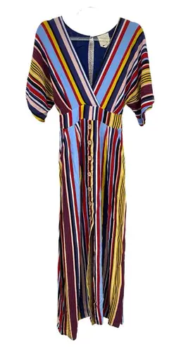 This Harper Heritage dress in a colorful stripe pattern is perfect for any occasion. With a V-neckline and cap sleeves, it features a zipper closure and a slit for added style. Made of rayon material and lined for comfort, this midi dress is available in size XS. Whether you're traveling, attending a wedding or party, or just dressing casually or for business, this A-line dress is sure to turn heads. Its multicolor design and striped pattern give it a playful, yet fashionable look. Don't miss out on adding this dress to your wardrobe!
