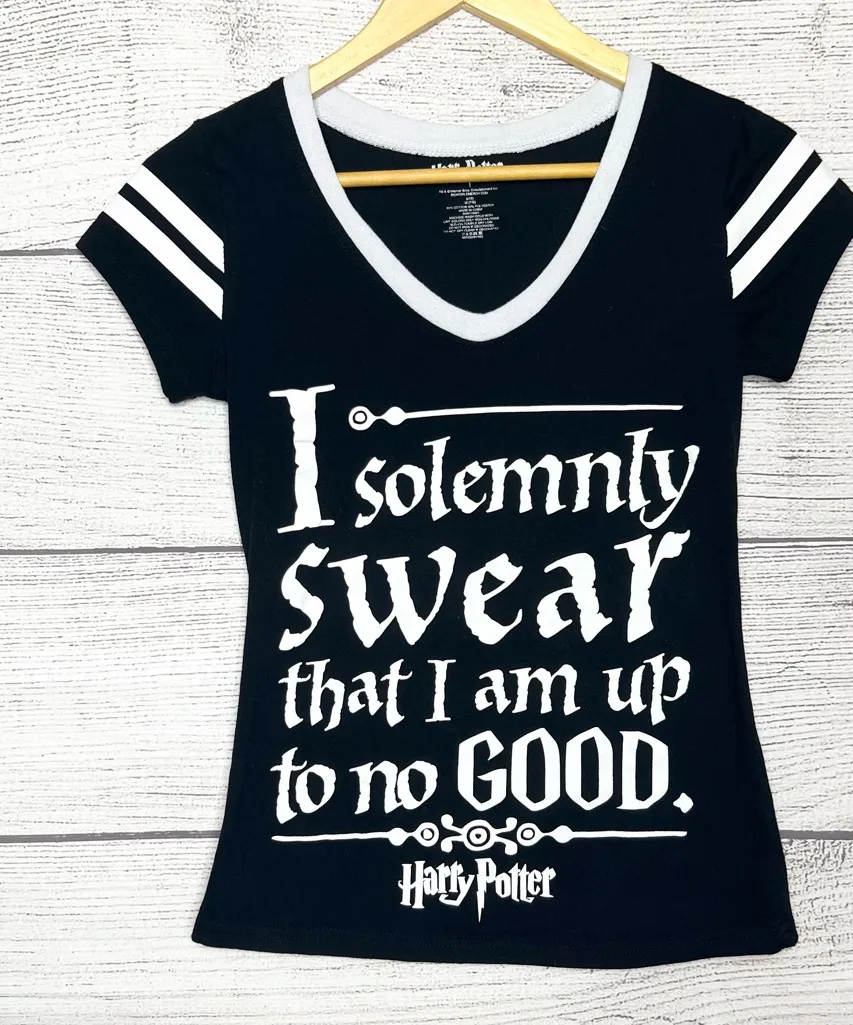 Harry Potter Black & White “I Solemnly Swear I Am Up To No Good” T-Shirt Size Medium Approximate flat lay measurements: Pit to pit: 16 inches Length from shoulder to hem: 22 inches Universal studios wizard hogwarts magic theme park books movies holiday casual back to school comfy