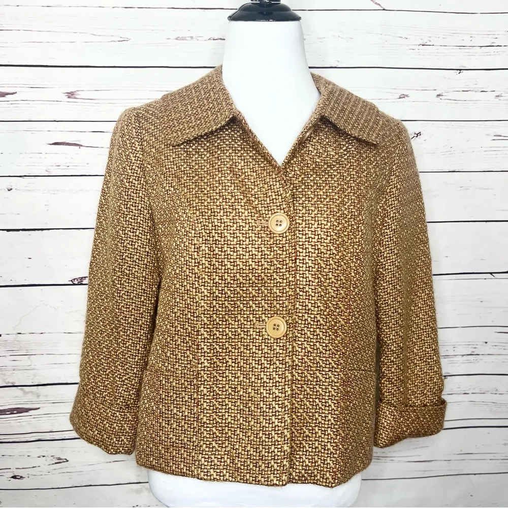 Chic and stylish Harve Benard Tan & Red Boxy Cropped Tweed Blazer Coat Jacket. Women’s Size Small in... Show more