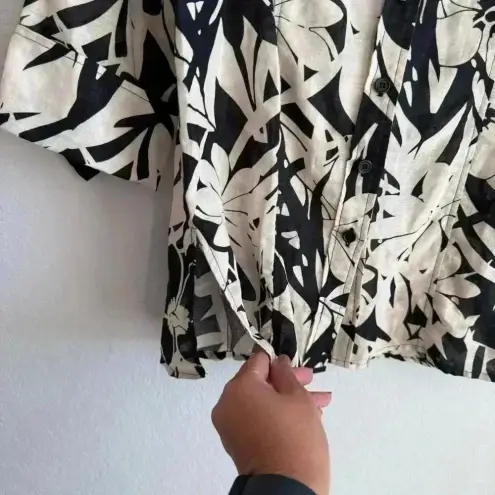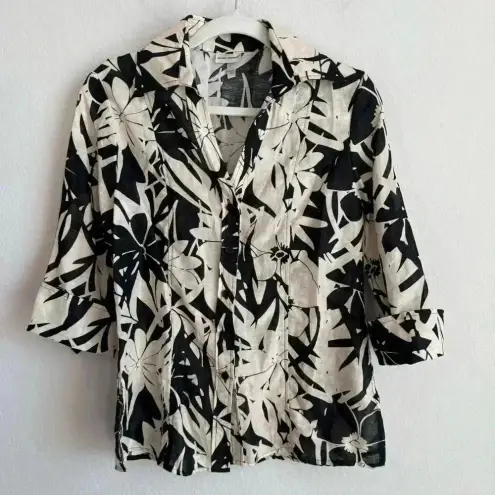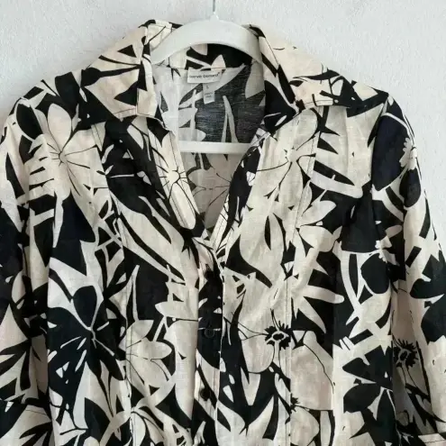 Very nice, brown, black and beige floral print 3/4 sleeve, collared, blouse by Harve Bernard. The top is 60% linen and 40% cotton. In excellent preowned condition. Size Large Length 26.5” Bust 20” Sleeves 19”