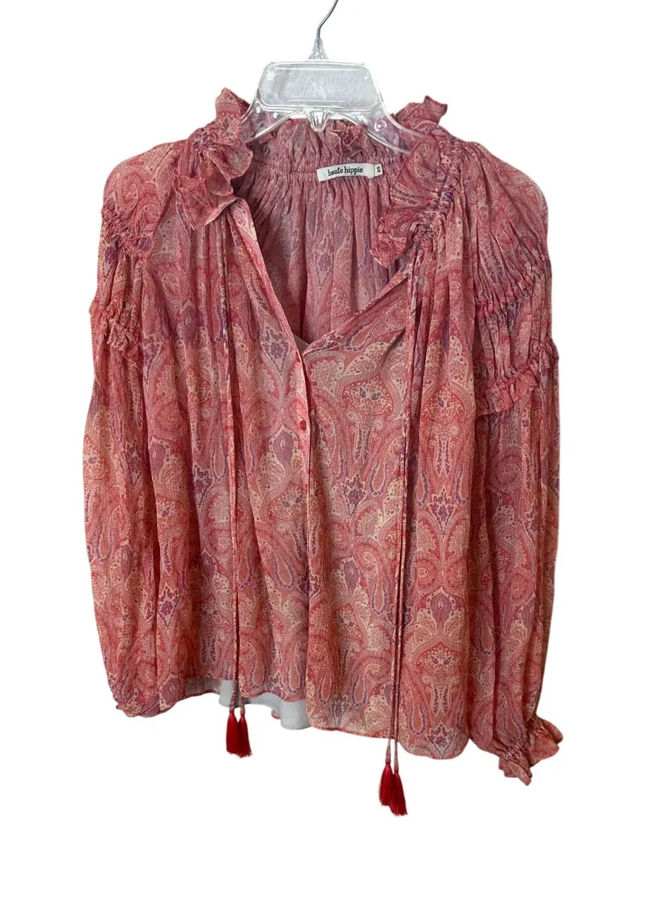 Haute Hippie paisley print blouse top with a ruffled neckline and tassel tie accents. This ethereal top features a flowy silhouette and a concealed button placket, offering a bohemian-chic aesthetic. Its sheer fabric is layered over an attached camisole for comfortable wear. Perfect for a casual daytime outing or a relaxed vacation look. Type: Blouse Department: Women Style: Tunic Material: 100% Silk Neckline: V-Neck Sleeve Length: Long Sleeve Sleeve Type: Balloon Sleeve Pattern: Paisley Accents: Ruffle, Tasseled, Button Theme: Bohemian, Hippie Features: Sheer Fit: Relaxed Fabric Type: Chiffon Occasion: Casual Closure: Button Keywords: Haute Hippie, paisley, ruffle, tassel, bohemian, boho, feminine, sheer, vacation, resort, festival, embroidered, flowy, designer