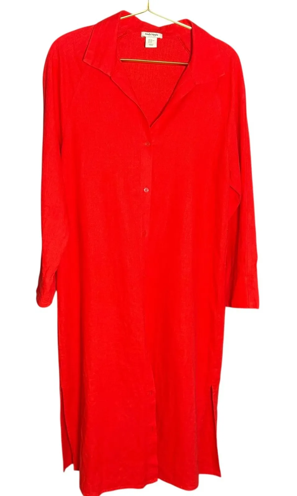 Discover effortless elegance with this striking red Haute Hippie Style shirt dress. Crafted from a breathable linen-viscose blend, this piece drapes beautifully, offering both comfort and a flattering silhouette. The classic collared neckline and button-front design create a polished look, while the relaxed fit and subtle side slits ensure ease of movement. Elevate your everyday style or pack it for your next getaway, wear as a dress or long jacket. This XS Haute Hippie red linen blend dress is in good preloved condition and will ship quickly from a smoke free home. Keywords: haute hippie, shirt dress, maxi dress, linen blend, viscose, red dress, button front, collared dress, relaxed fit, casual dress, vacation dress, resort wear, womens dress