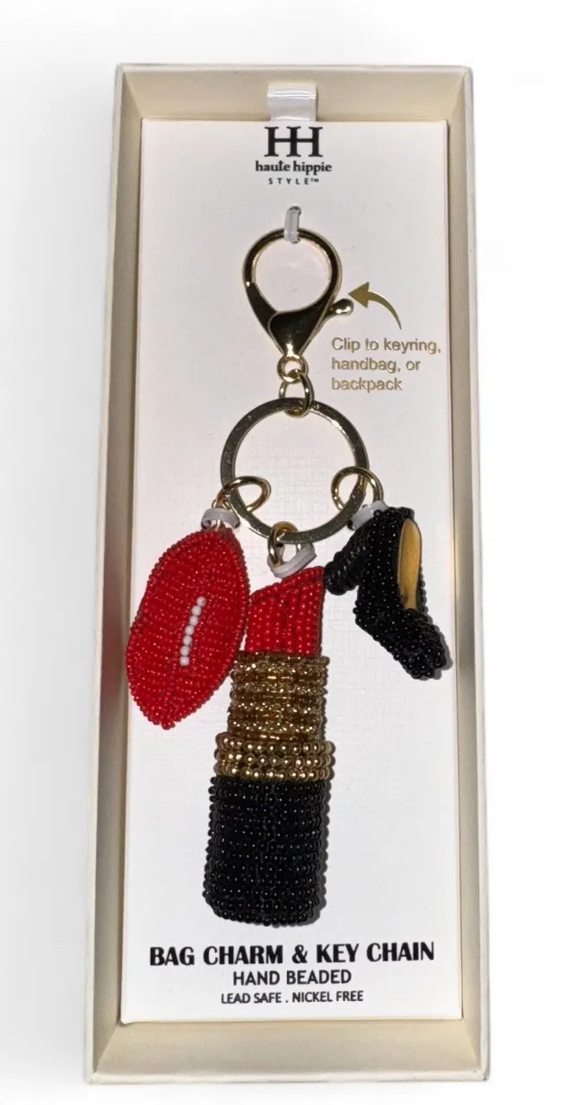 Adorn your accessories with this playful hand-beaded bag charm and keychain, designed to spark joy and express your vibrant personality. The striking red lips and glamorous black stiletto heel, intricately crafted with shimmering beads, dangle playfully alongside a detailed gold-banded lipstick, creating a captivating statement piece. This delightful charm attaches easily to your favorite handbag, backpack, or keyring, instantly elevating your everyday style. Perfect for adding a touch of whimsical flair to a night out, a special occasion, or just to brighten your day. Department: Women Accents: Beaded Material: Beads Theme: Glam Style, Fashion Style: Charm Keywords: Haute Hippie Style, bag charm, keychain, beaded, lipstick charm, lips charm, high heel charm, designer bag charm, luxury keychain, gift for her, fashion accessory, women's accessory, handbag charm, backpack charm, jewelry