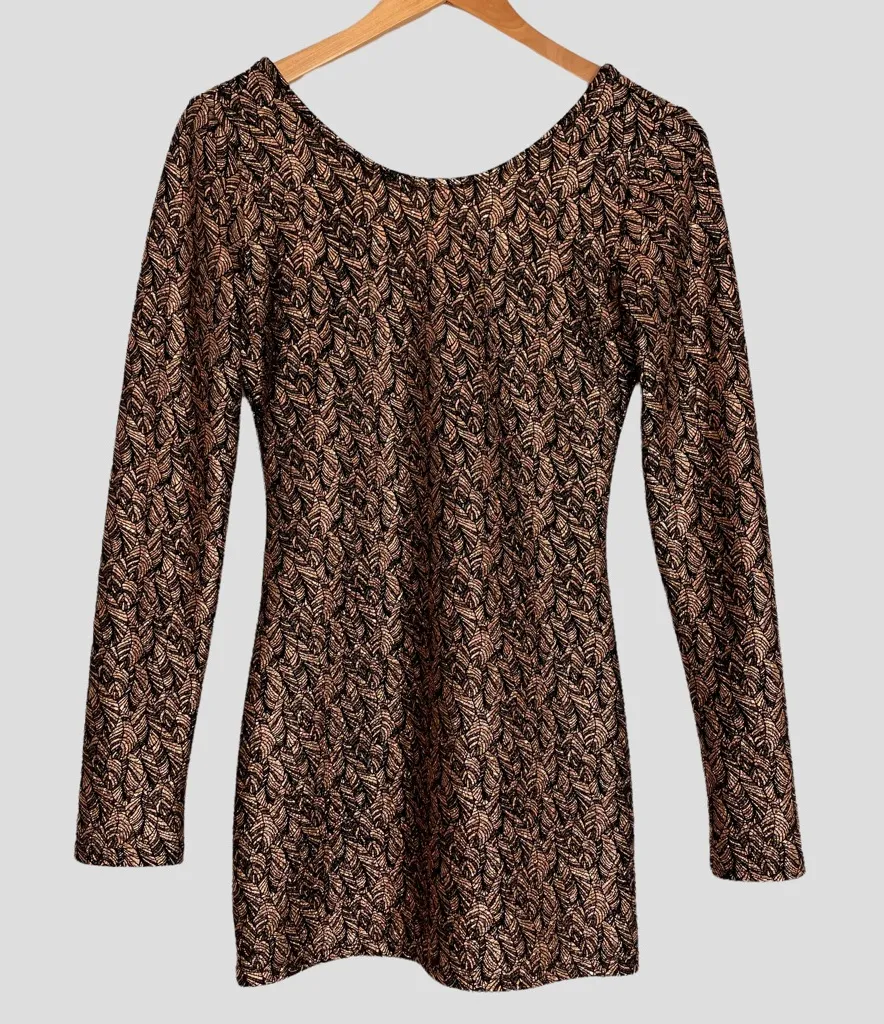 Haute Monde short dress with metallic layered leaf-like pattern. Extra long sleeves. Scoop neck in f... Show more