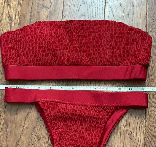 Beautiful deep red bikini. Top and bottom included. Worn once. Thick band. Nice quality swimsuit. Thick material so nothing shows through. Could be worn with or without straps