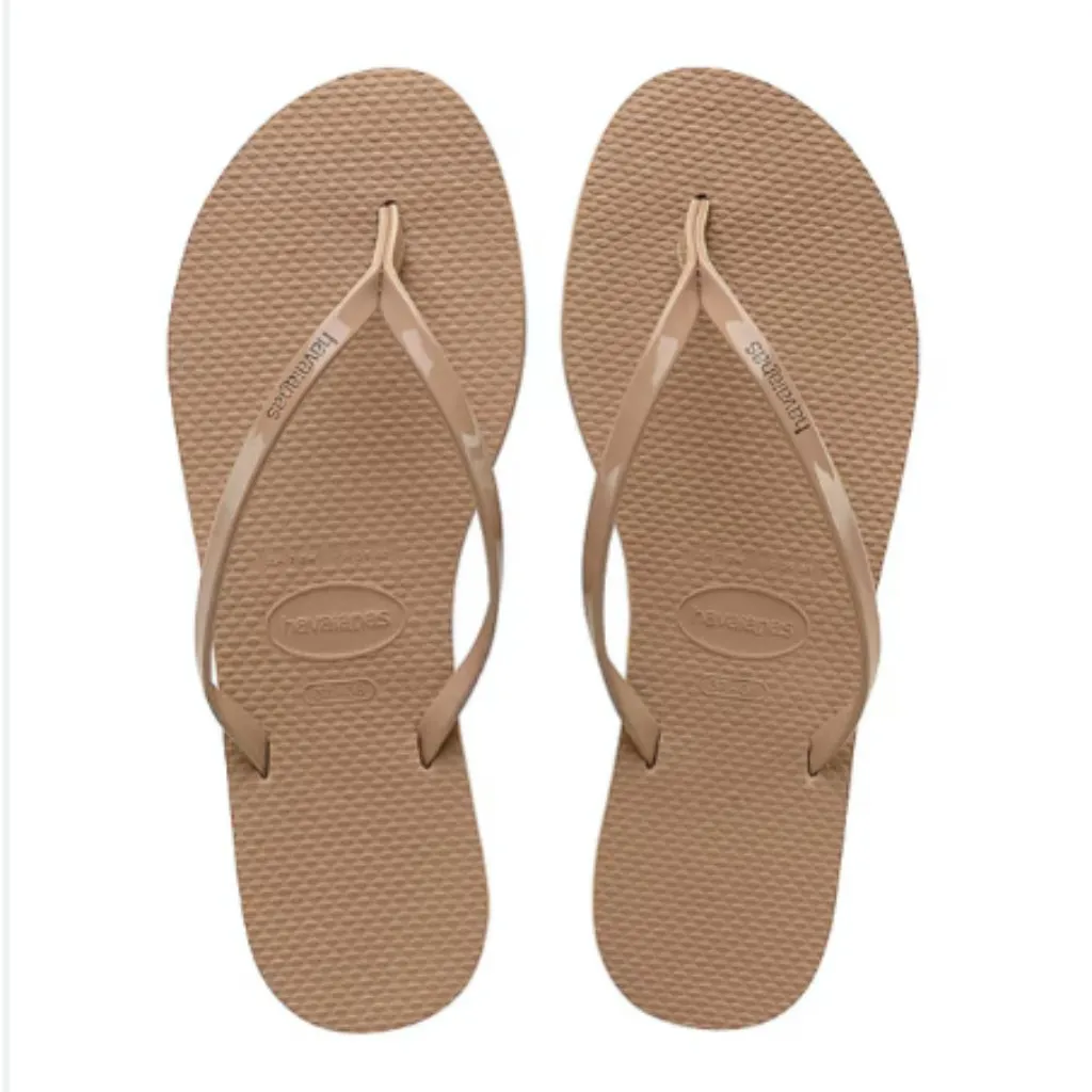 *CURRENT ITEM $42* The Havaianas® You Metallic Flip Flop Sandal has thong-style construction for easy slip-on styling. Nude, metallic laminated straps with embossed logo. Open-toe silhouette with center thong post and a bi-layer cushioned footbed provides long-lasting comfort. Synthetic upper features a glossy finish with a breathable synthetic lining and a textured synthetic outsole. New Condition without Box Made in Brazil *Photos 1-3 are stock images*