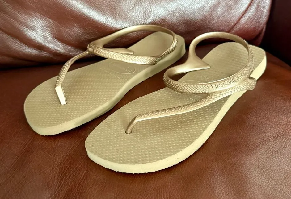 Step into comfort with these Havaianas Flip Flops in Women’s Size 9, featuring a neutral gold/tan metallic tone that pairs effortlessly with jeans, shorts, swimwear, or resort looks. These sandals are like new, showing little to no signs of wear. Details & Features: • Classic Havaianas cushioned sole • Slim metallic straps for a stylish finish • Lightweight & flexible • Water-friendly — perfect for beach, pool, travel, & everyday wear • Durable rubber outsole for comfort & support 🌴 Perfect For: vacation, pool days, summer outfits, beachwear, resort style, travel, casual errands, and warm weather staples. Havaianas Sandals, Flip Flops, Metallic Sandals, Size 9 Sandals, Gold Flip Flops, Beach Sandals, Vacation Sandals, Pool Slides, Summer Shoes, Travel Essentials, Like New Shoes, Neutral Sandals.