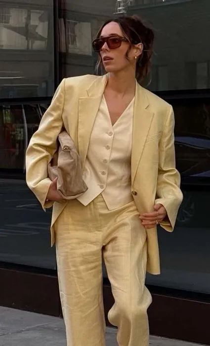 HAVE Linen Polka Dot Butter Yellow Blazer Small Cottage Scandi Layering 90s Charming HAVE linen blend blazer in a soft butter yellow with playful white and black polka dot details, size Small. Lightweight and breathable, perfect for layering in warmer seasons while adding a cheerful vintage-inspired touch. Features a structured yet relaxed fit with classic lapels and button front. Ideal for cottagecore styling, Scandinavian minimalist outfits, or 90s retro layering. First pic is for styling purposes only, not actual item. Details: • Brand: HAVE • Size: Small • Color: Butter Yellow with White Polka Dots • Fabric: Linen blend • Features: Lightweight, breathable linen, polka dot print, button front, lapel collar • Style: Cottagecore, Scandi chic, retro 90s, layering essential • Condition: Gently worn Keywords: linen polka dot blazer, butter yellow jacket, cottagecore layering, Scandi minimalist outerwear, vintage 90s blazer, HAVE brand blazer