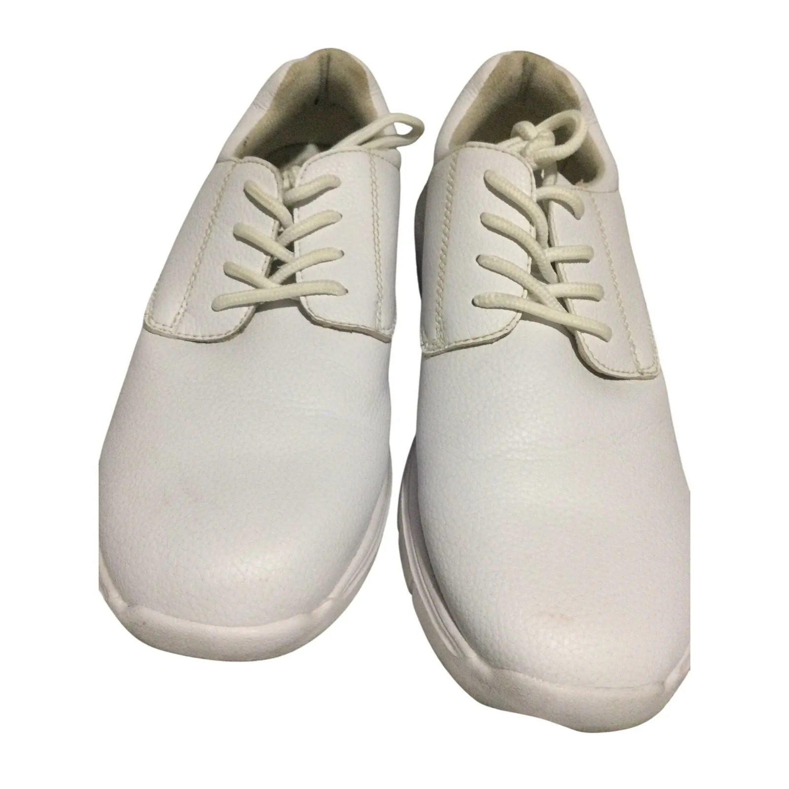 Step into effortless comfort and timeless style with these pristine white leather shoes. Designed to cradle your feet with every stride, the supple leather embraces your foot, offering a smooth, gentle touch that promises all-day ease. The classic lace-up design ensures a secure and personalized fit, while the subtly textured leather adds a refined aesthetic. The flexible sole, with its unique hexagonal tread, provides reliable grip and support, making them perfect for busy days on your feet. Imagine yourself moving through your day with confidence and ease, whether you're navigating the demands of a healthcare setting, attending classes, or simply enjoying a polished casual look. These versatile shoes are an ideal companion for nurses, students, and anyone seeking dependable, stylish footwear for daily wear. Style: Oxford Department: Women Type: Casual Upper Material: Leather Lining Material: Fabric Insole Material: Fabric Pattern: Solid Outsole Material: Rubber Closure: Lace Up Features: Comfort, Cushioned, Padded, Supportive, Non-Slip Heel Height: Flat (Under 1 in) Keywords: white leather shoes, women's comfort shoes, lace up shoes, nurse shoes, work shoes, school shoes, professional shoes, casual shoes, walking shoes, supportive footwear, all day comfort, classic style, durable shoes, womens size 10