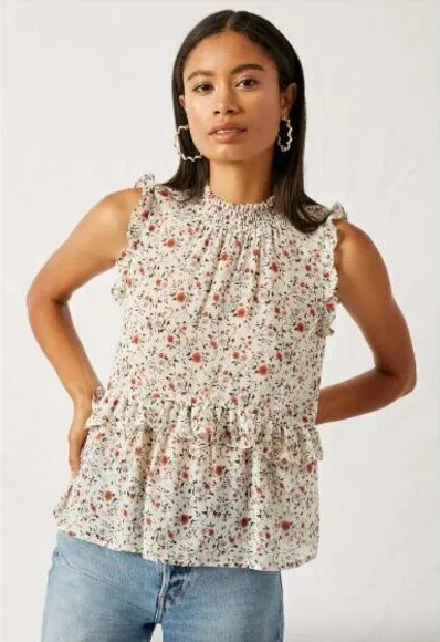 White with colorful floral print Peplum ruffle hem Smocked high neckline Ruffle cap sleeves Lightwei... Show more