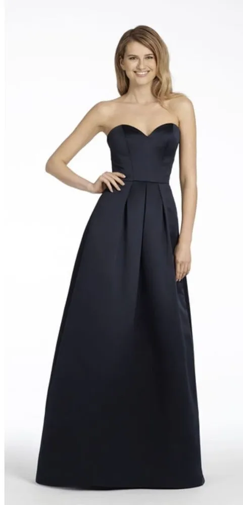 Hayley Paige Strapless A-Line Satin Gown Sweetheart Neckline Indigo Blue Size 8 Size: 8 Condition: New with tags Features: Sweetheart neckline A-Line Indigo blue color Ribbing inside for support Sleeveless Zip up back closure Satin material Box pleating Perfect for a wedding, bridesmaids dress, formal, ball, prom Material: 100% polyester Measurements: See photos for approximate measurements 3 pounds HNG