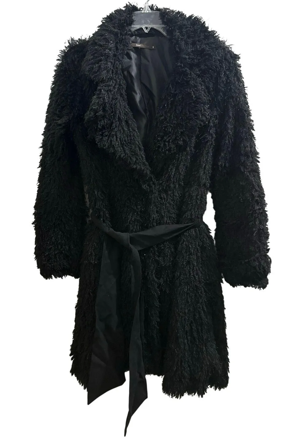 Hazel by Anthropologie brand teddy jacket. Long pile faux fur material made of polyester. Possibly Mongolian faux fur because of its longer stringy length and wavings. Super dark black color with a bit of sheen. Large floppy collar. V-neckline. Closes up with a snap and a tie for the inside. Also has a soft faux suede tie belt on the outside. Longer length hits around the thigh. A very glamorous funky look. Like rockstar chic. Could be worn for work or for a fancy formal event. Inside is lined and smooth like satin. Excellent used condition. Dry clean only. Size small.